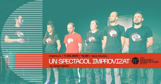 UN SPECTACOL IMPROVIZAT va avea loc la Sala Studio, miercuri 17 septembrie de la ora 19. Construit ad-hoc, pe baza sugestiilor din partea publicului, deja bine cunoscutul și îndrăgitul impro - susținut de Ioana Cheregi, Andrei Stan, Andrei Gîjulete, Vlad Mureșan și Sergiu Tăbăcaru - oferă o oră de distracție garantată.